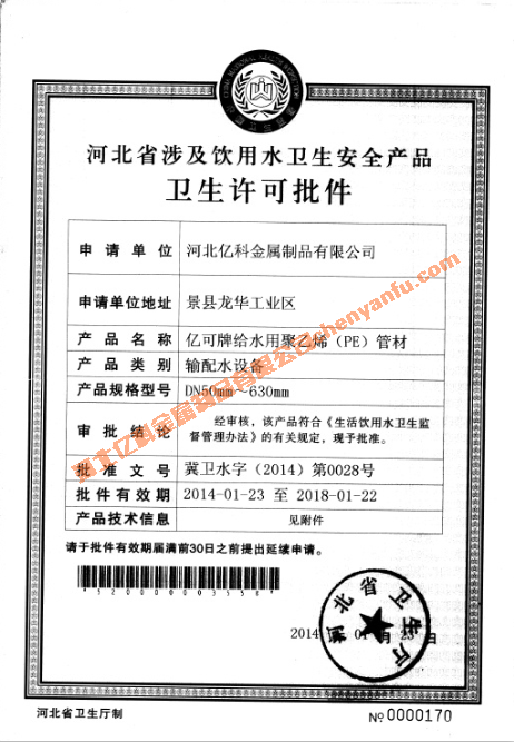 衛(wèi)生許可批件50-630